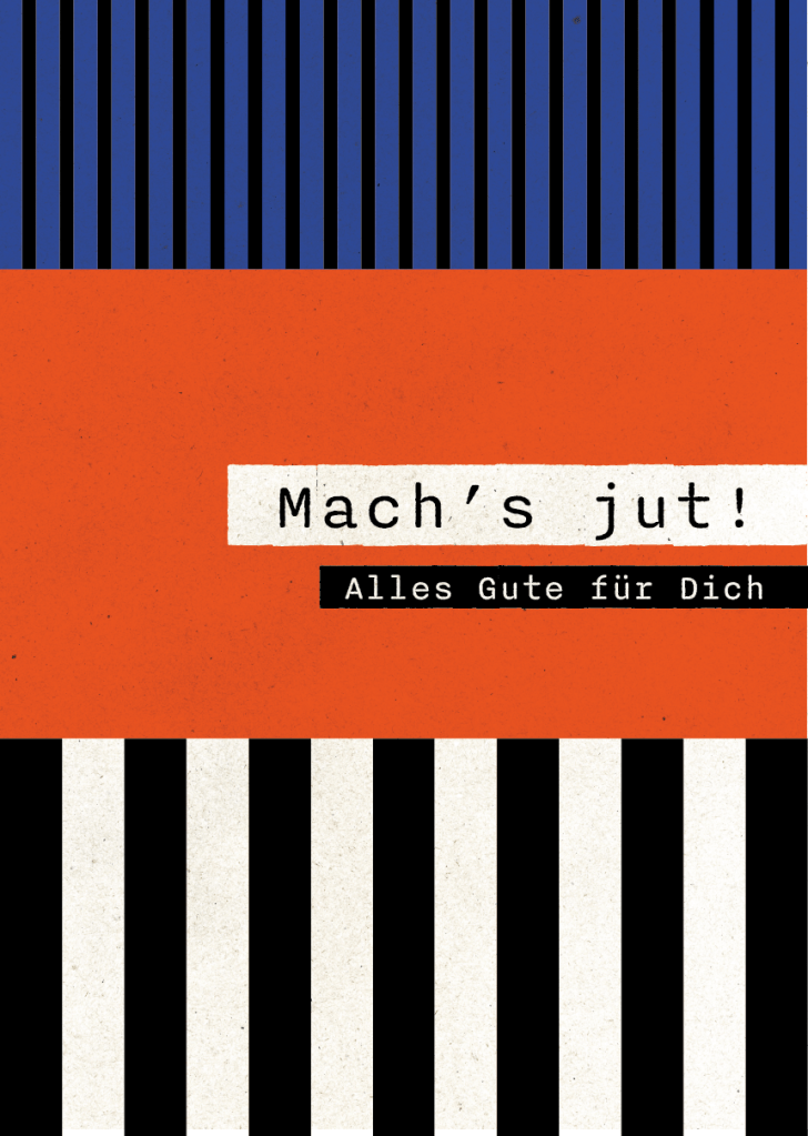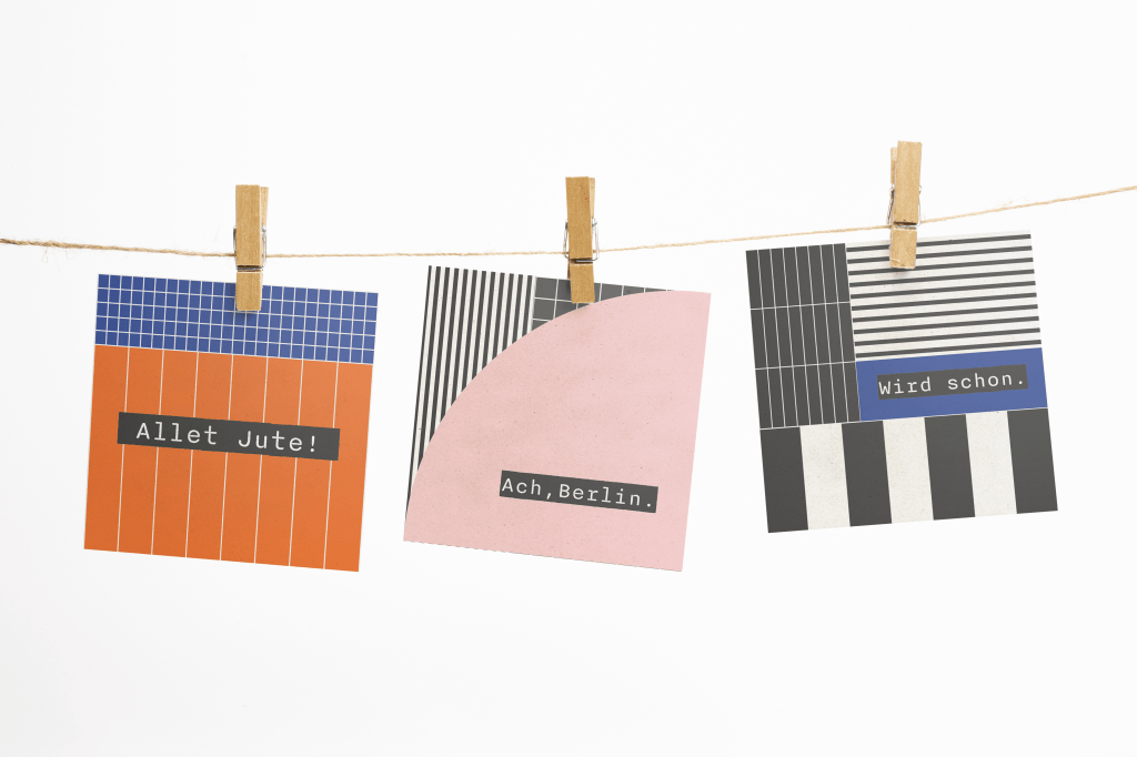 As a Brandenburger living in Berlin, I noticed that there are hardly any postcards with typical postcards, posters etc. with typical expressions of the Berlin dialect and that reflect the attitude to life in Berlin (and if there are any, I don’t particularly like them.) So as a personal project, I decided to design postcards with those expressions such as ‚Mach’s jut‘, ‚Tach‘ or ‚Wird schon‘. The layout is inspired by the tile patterns of Berlins underground stations.