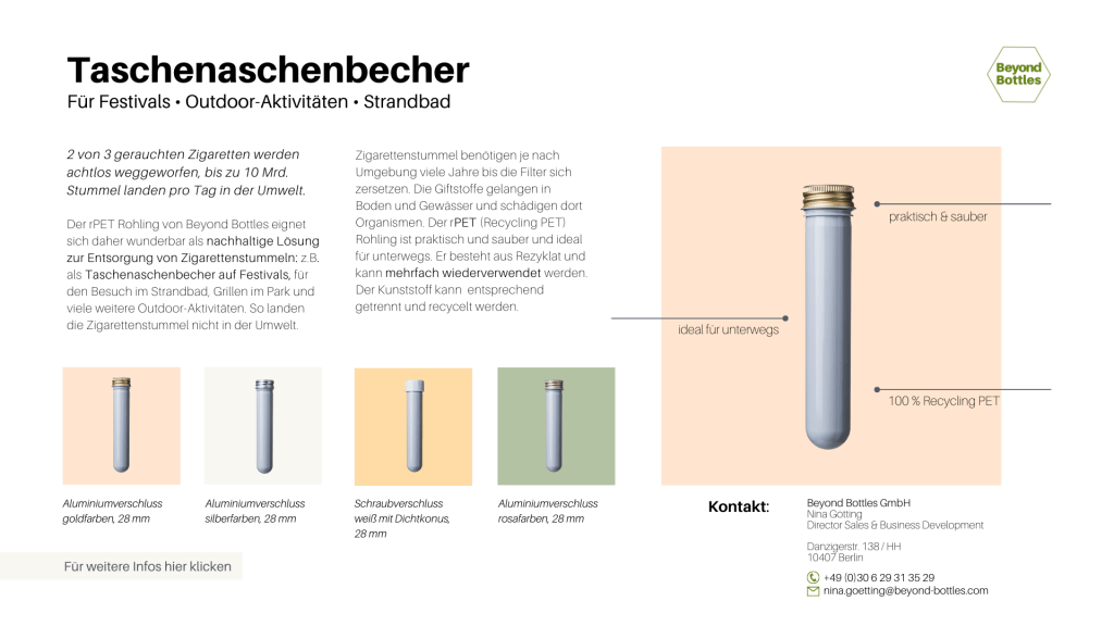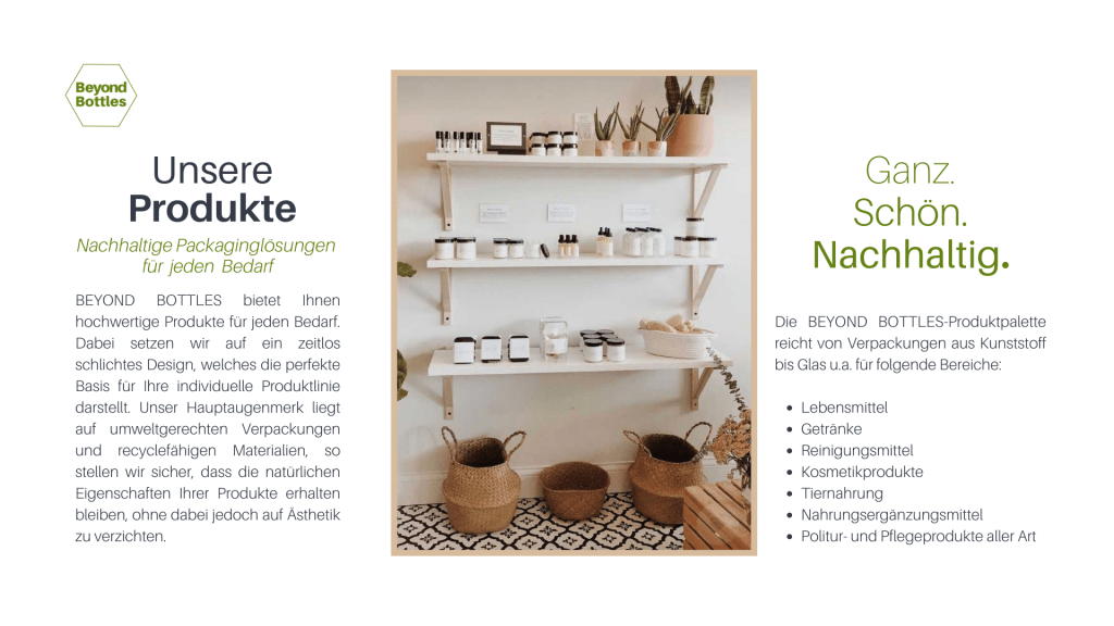 For Beyond Bottles I created flyers and the company presentation. The clear and environmentally friendly approach is also reflected in the design.